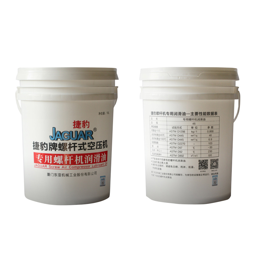 捷豹牌螺桿式空壓機選用原裝進口高品質螺桿式空壓機專用油,采用精制石蠟基基礎油及特選添加劑調制而成的優質無灰型空氣壓縮機油。給金屬表面提供全面的保護,同時有極佳的抗氧化性和熱穩定性,也有良好的抗磨性、分水性、空氣釋放性以及防腐蝕特性。